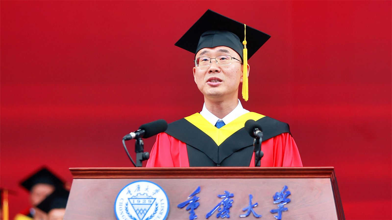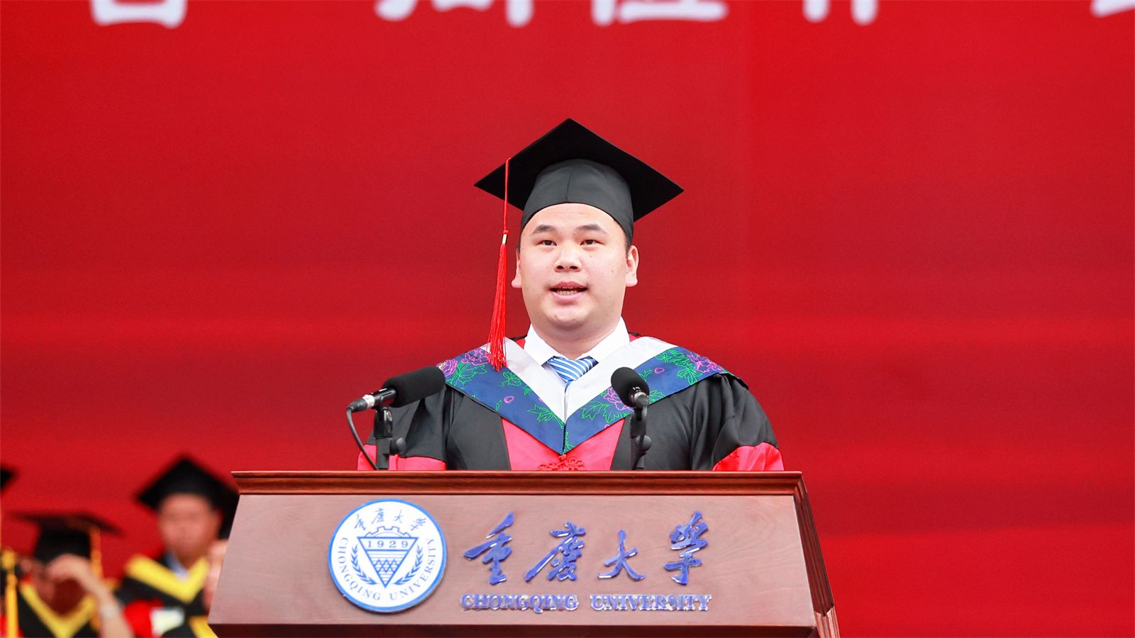 物理學(xué)院2024屆博士畢業(yè)生馬江平代表研究生發(fā)言。他深情講述了自己在重大四年時間里的科研求索之路,鼓勵畢業(yè)生以青春之“小我”擁抱時代之“大我”,把個人奮斗“小目標(biāo)”融入黨和國家事業(yè)的“大藍圖”,在新征程中,一路追光、一路向上。