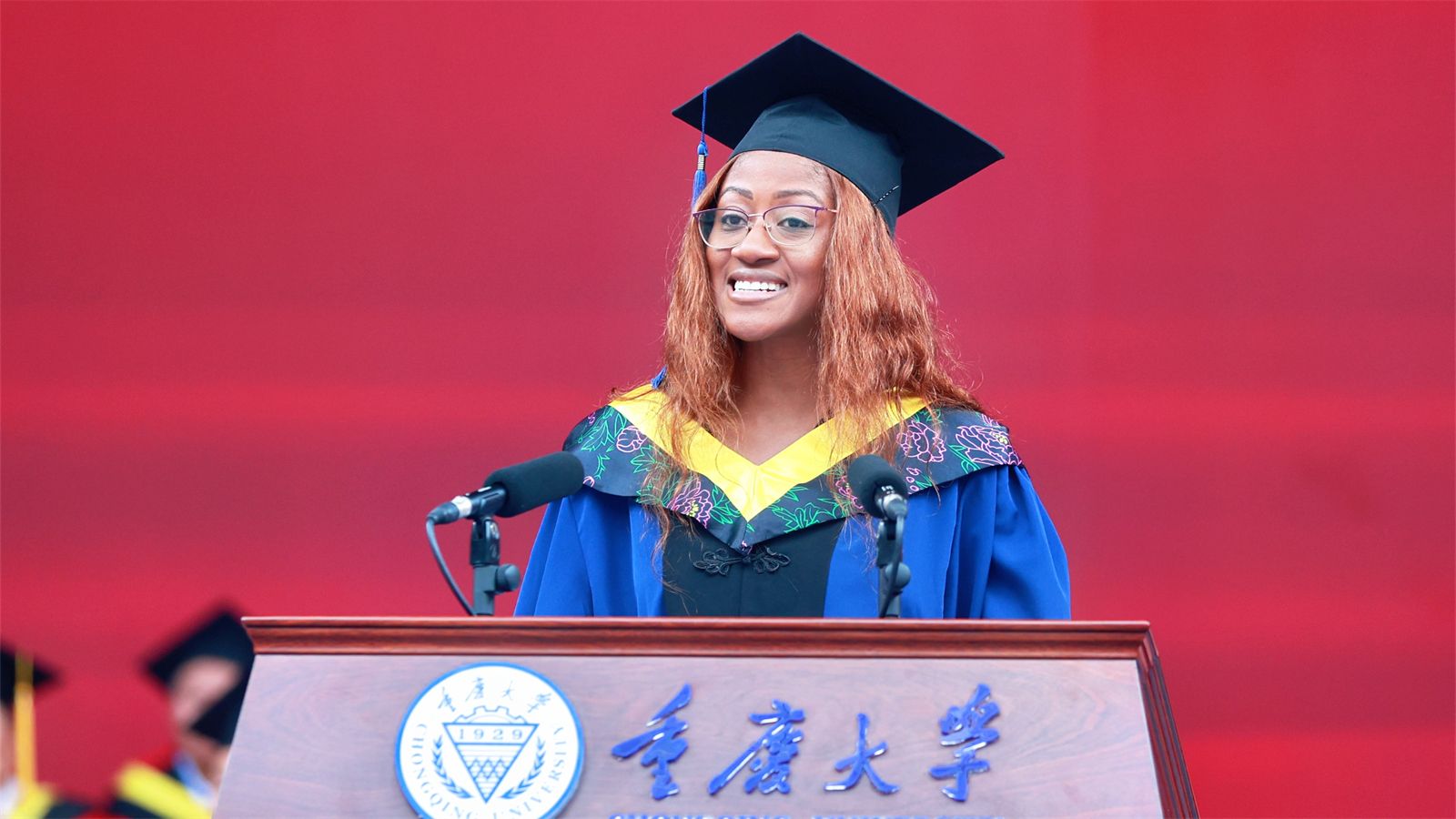 留學(xué)生代表、管理科學(xué)與房地產(chǎn)學(xué)院2024屆碩士畢業(yè)生Brooks Schanelle Lison(韌玫)生動講述了她與重慶、重大九年的難忘回憶,“我渴望把在重慶大學(xué)學(xué)到的東西帶回我的家鄉(xiāng),為我們的社會發(fā)展作出貢獻,并成為我們兩種文化之間交流的橋梁。”