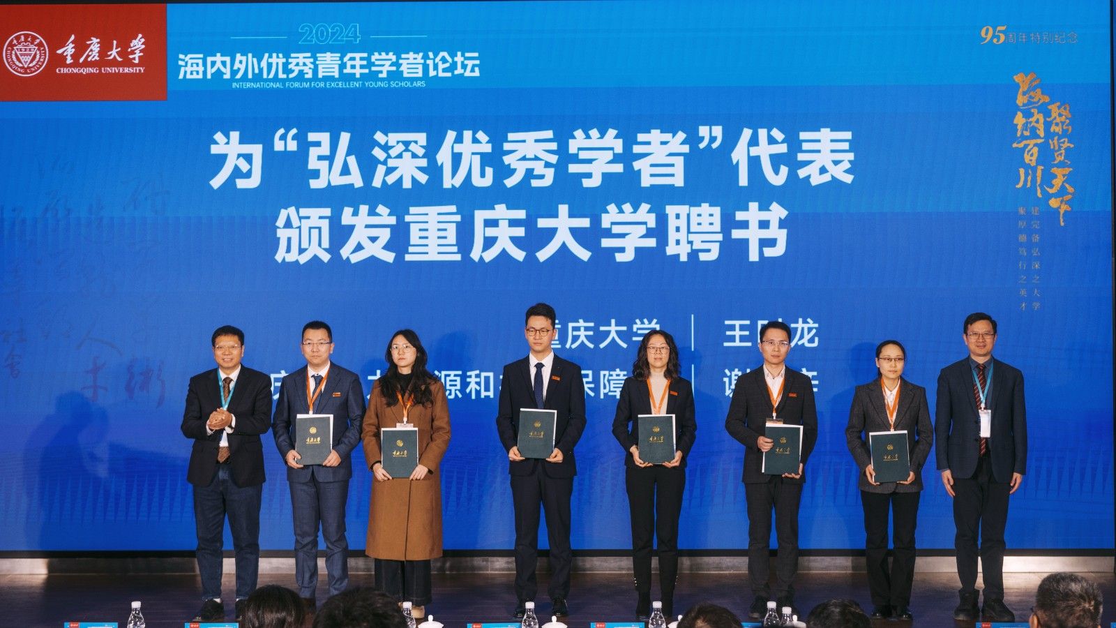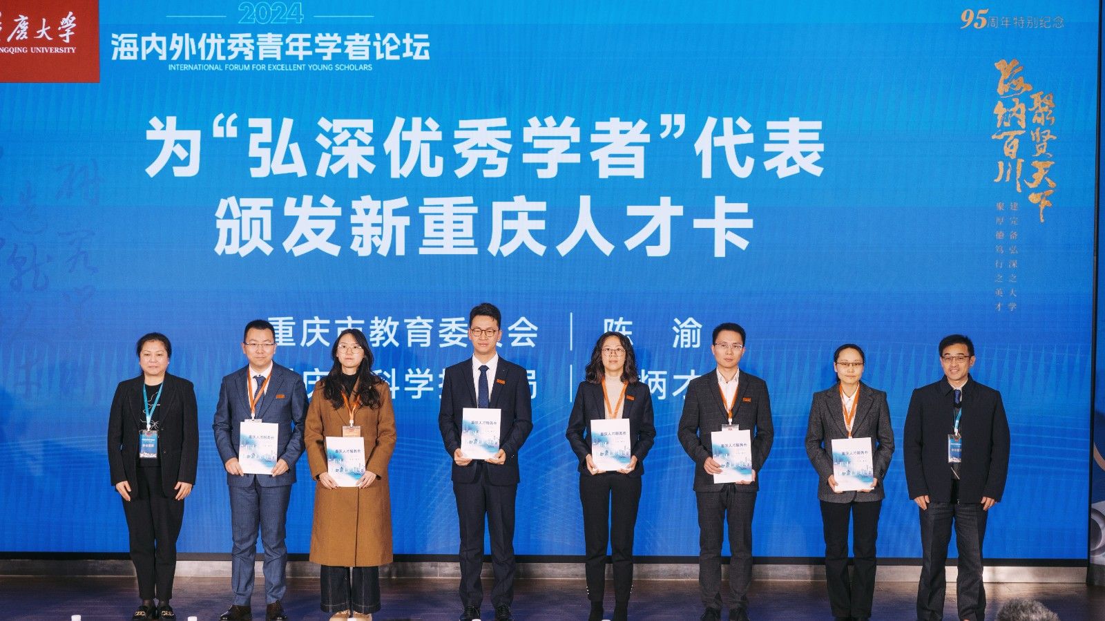 隨后,陳渝、陳炳才為新進入職重慶大學的弘深優秀學者代表頒發“新重慶人才卡”,王時龍與謝辛為他們頒發崗位聘書。弘深優秀學者代表、前沿交叉科學研究院、化學化工學院黃小洋教授分享了與學校的結緣故事以及入職感受,他感謝學校、學院給予的大力支持,并誠摯邀請海內外青年才俊相約重慶大學,扎根重慶,共同開創美好的事業。