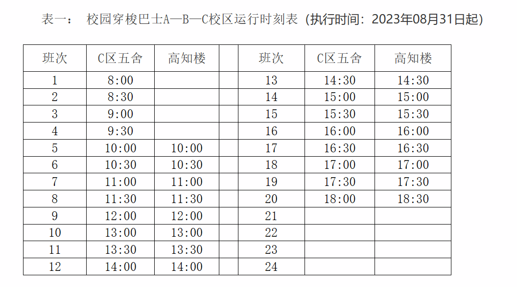 校園穿梭巴士A、B、C校區運行時刻表